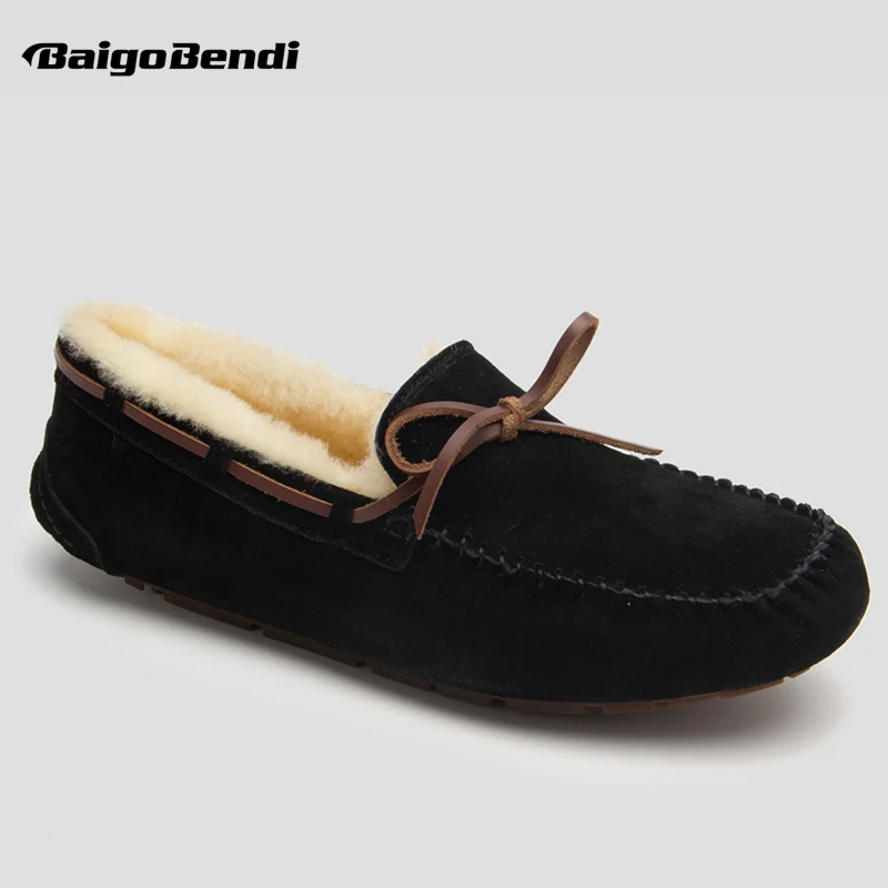 Men Cow Suede Leather Bowknot Super Warm Plush Loafers Casual Shearling Driving Car Shoes Winter Co